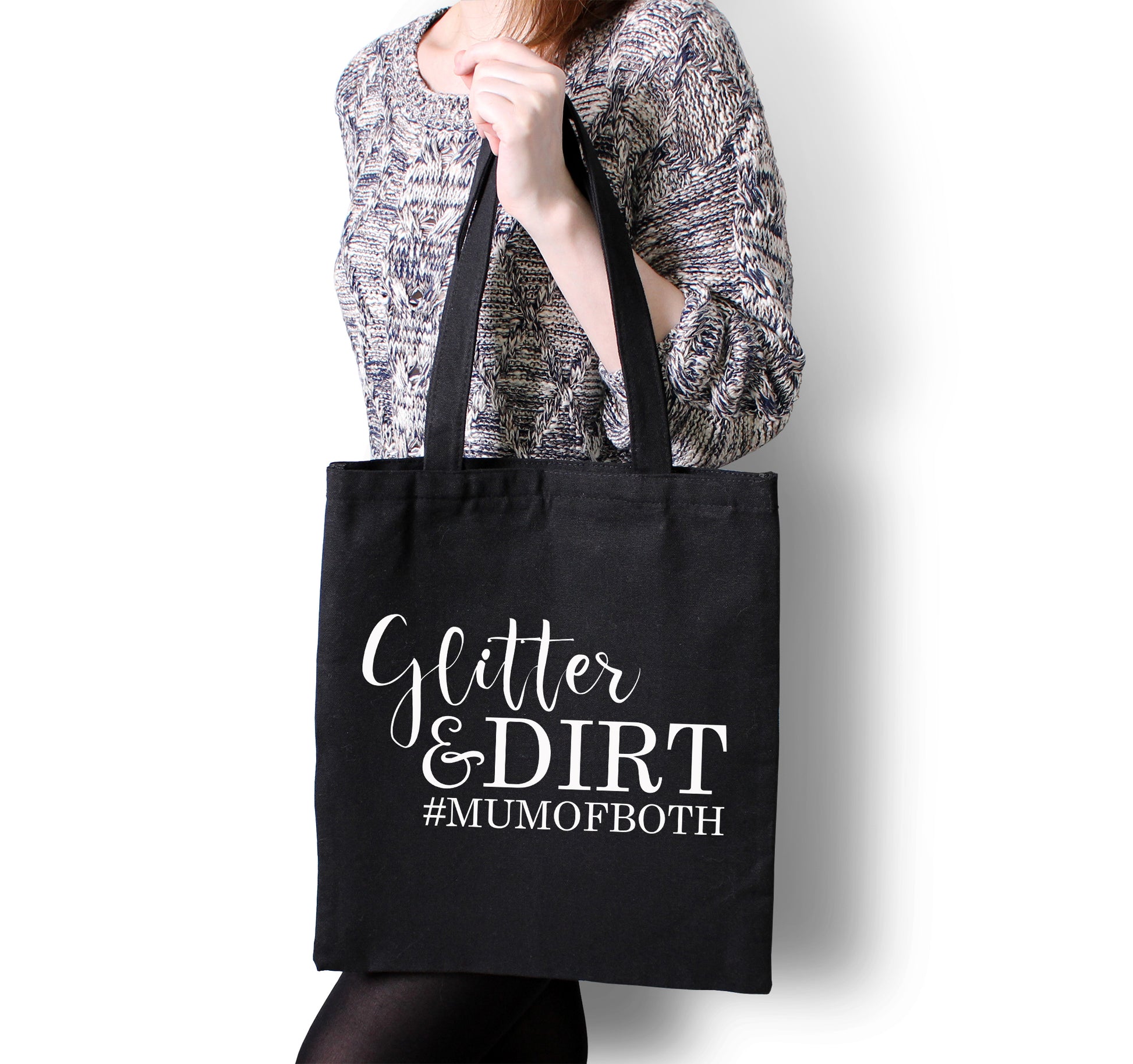 Cute tote bag for a mummy of both - Glitter and Dirt. Choice of many different colours of bags and choice of text colour to suit your taste.