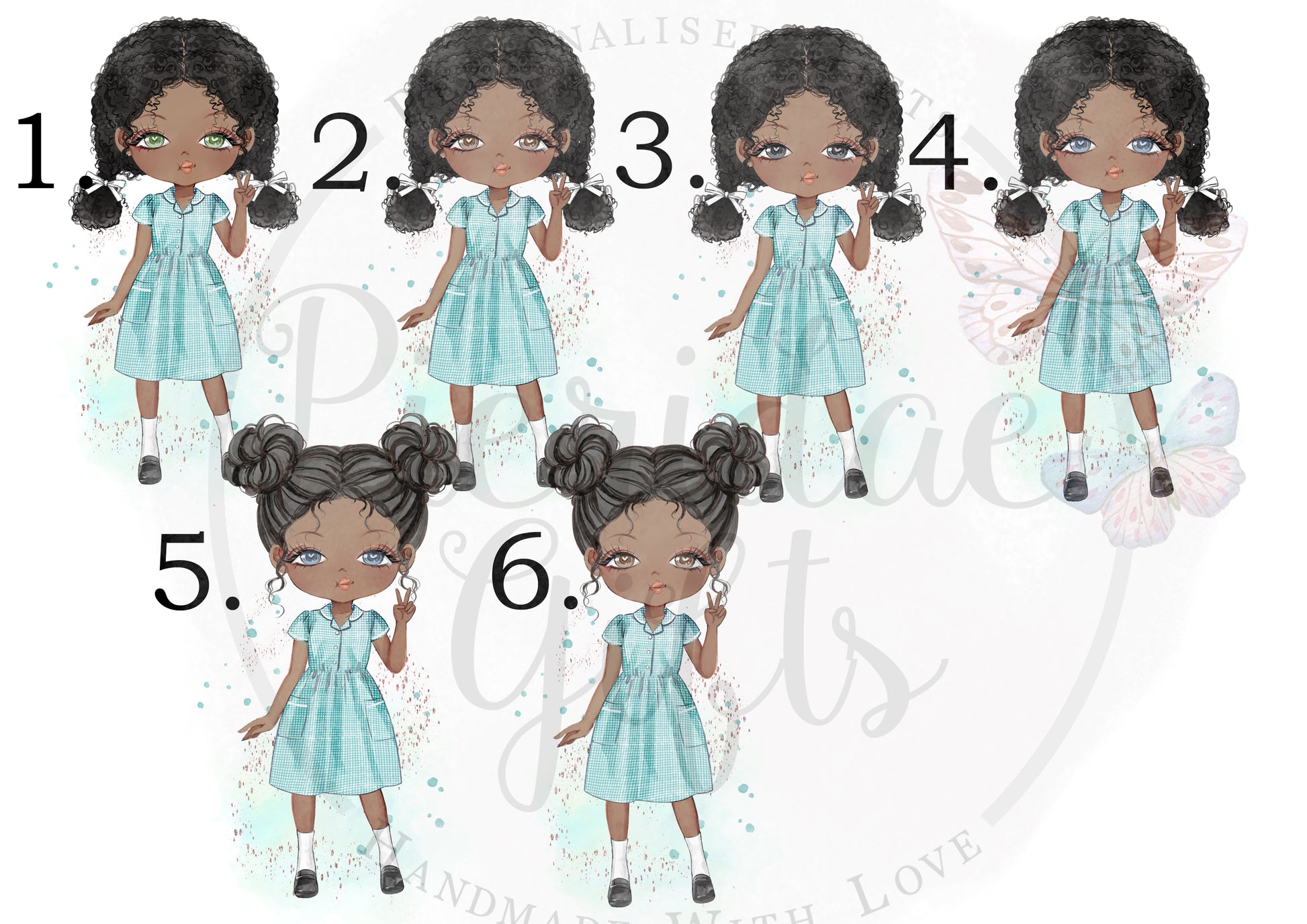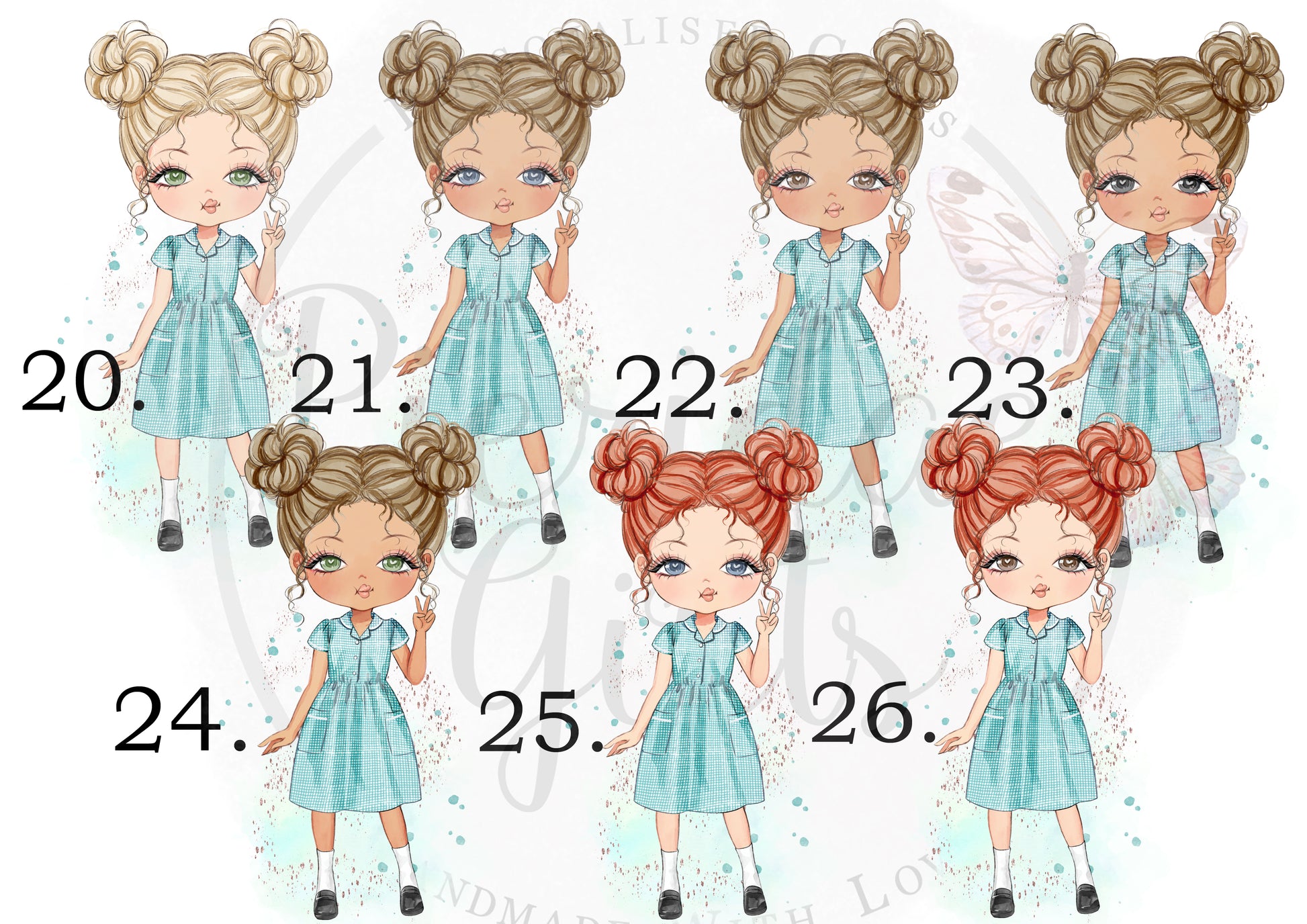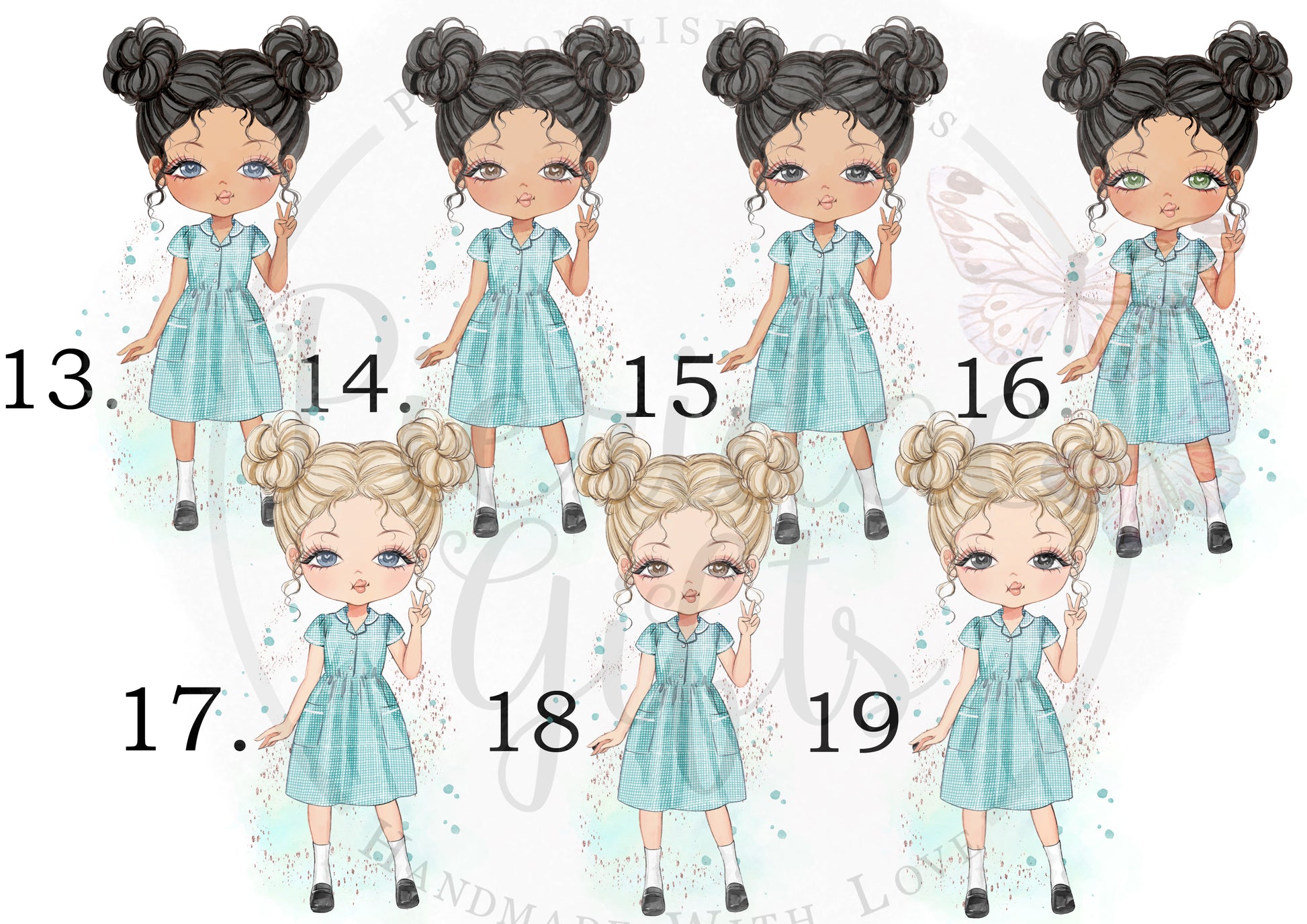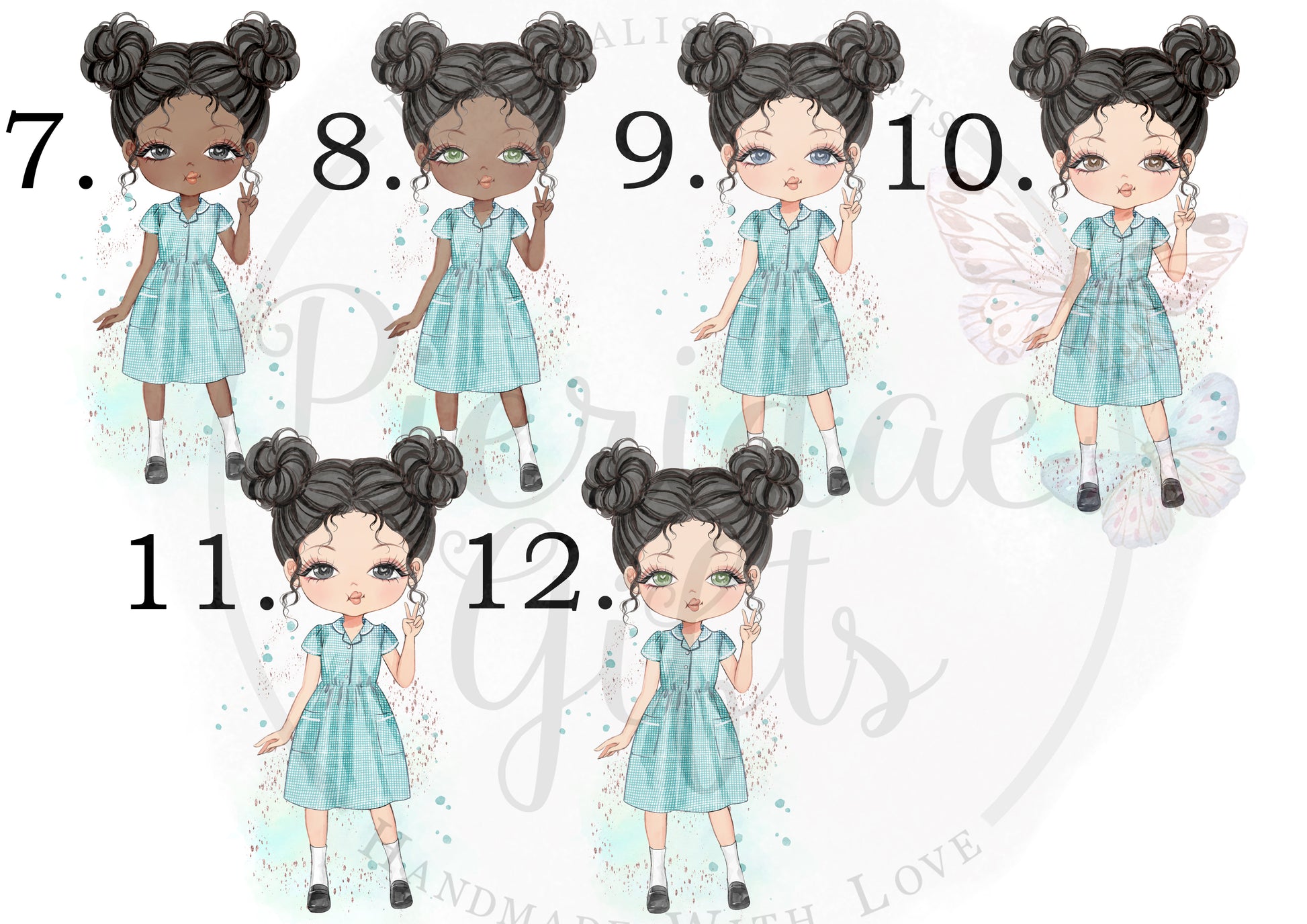 We also do this character in a Yellow, Red, Pink, Purple and Blue dress. This listing is for the Green Dress character.