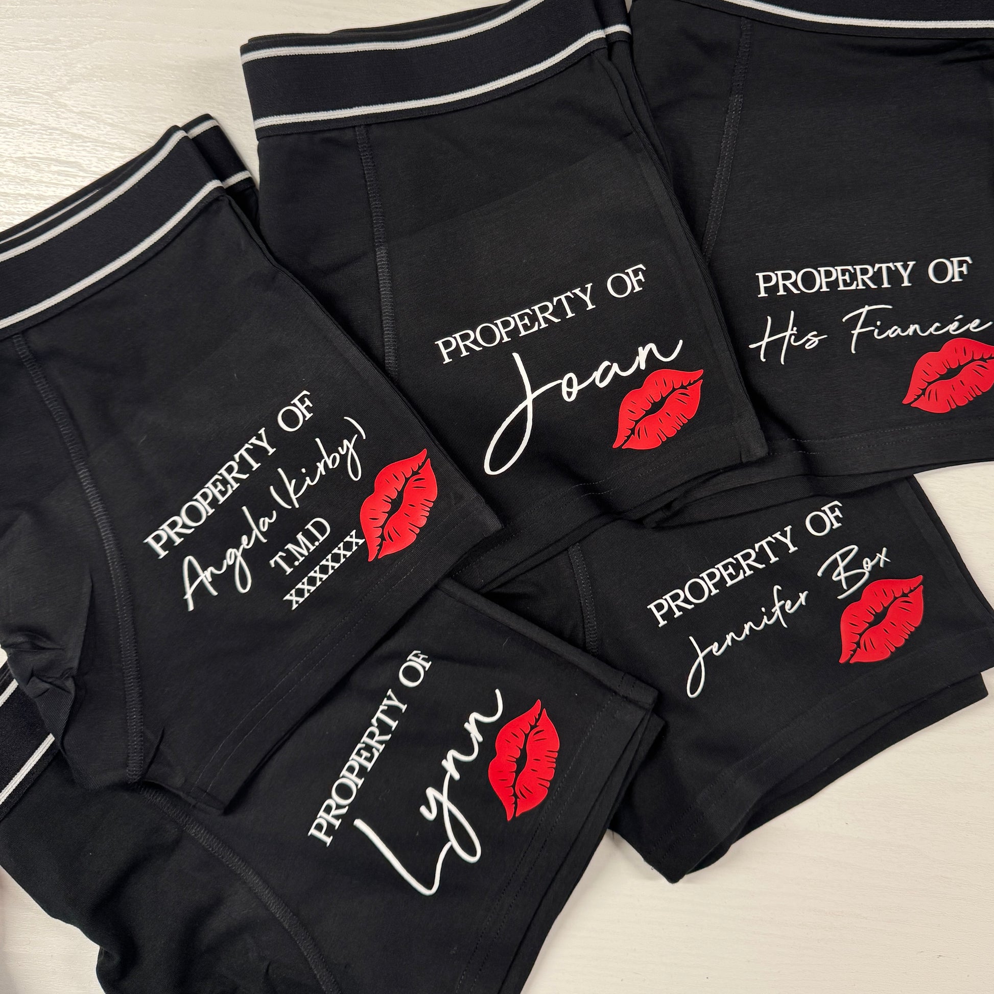 PERSONALISATION: Please let us know what you would like on your Boxers Property of' and the red lips come as standard. There is a box where you can put your personalisation in for your name. We will print what we receive. So please ensure you provide us with the correct details and spelling.