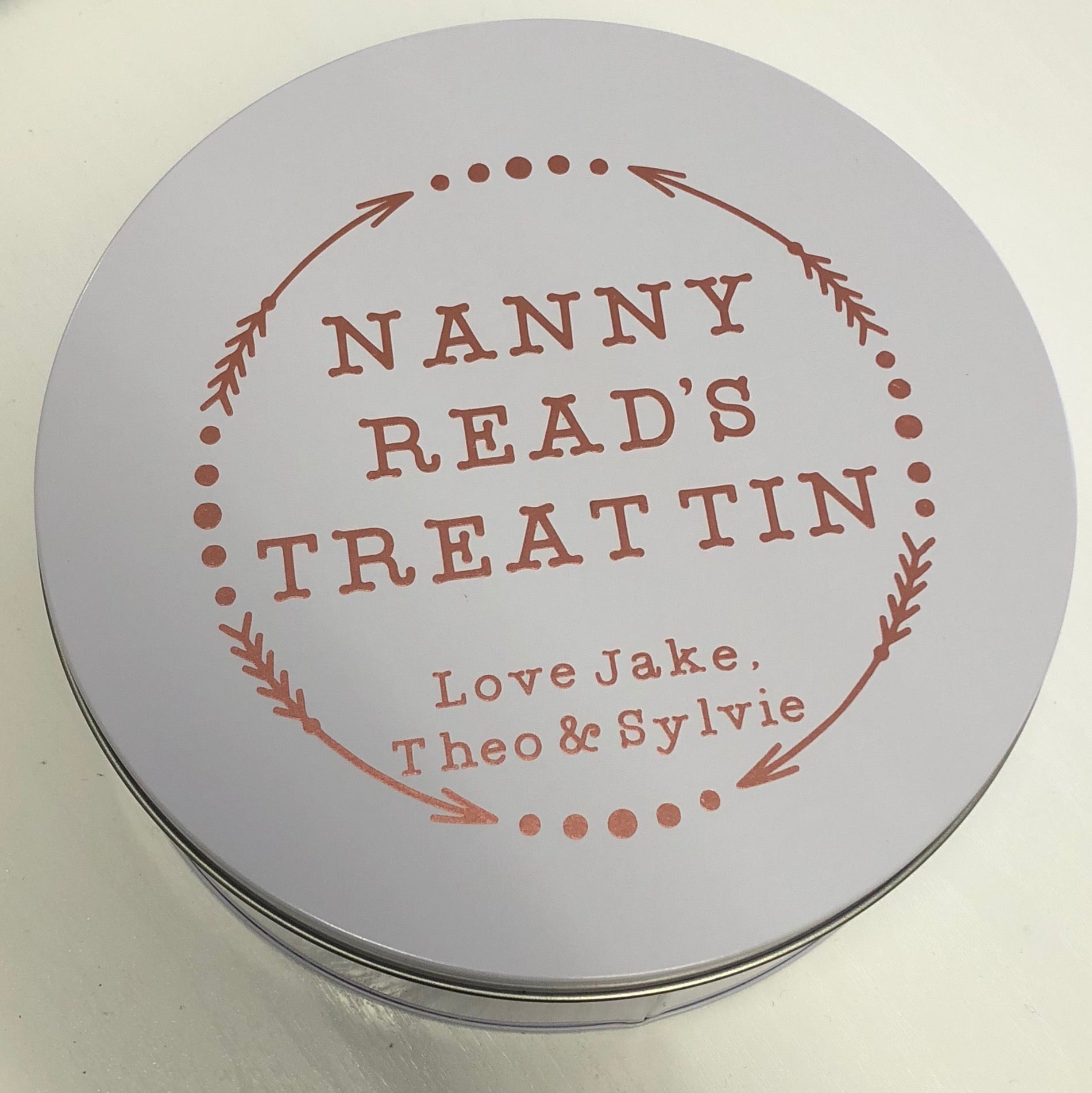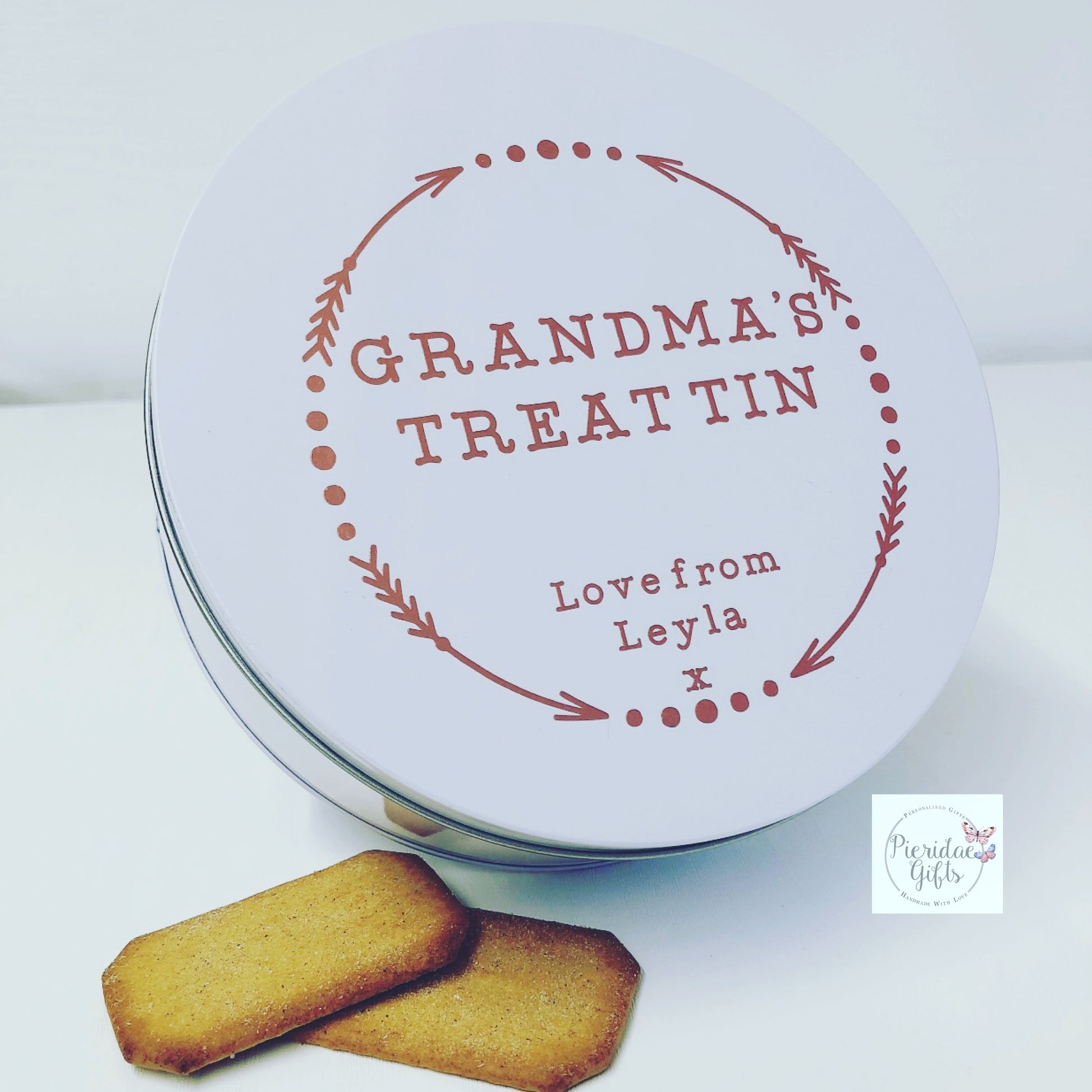 Please let us know in the box provided as to what exactly you would like on your tin. If no notes are left you will receive the tin with 'Grandma' title reading 'Grandma's Treat Tin'.